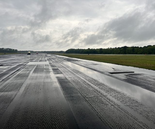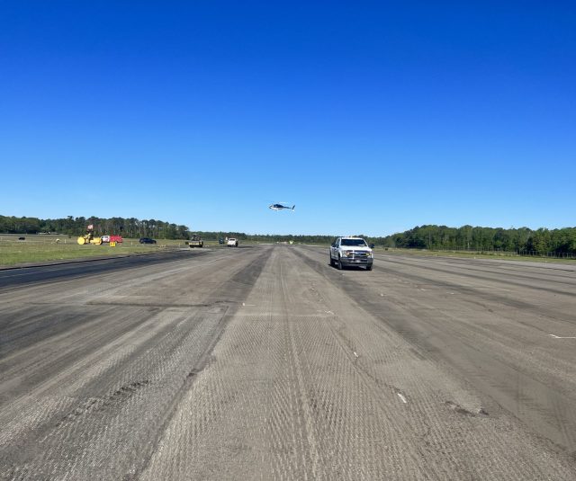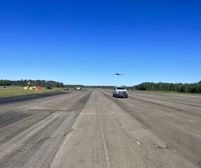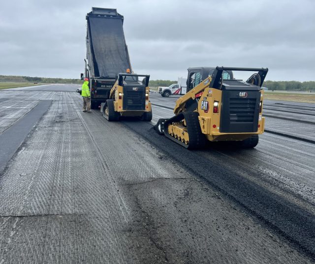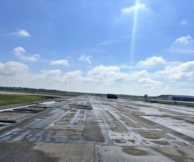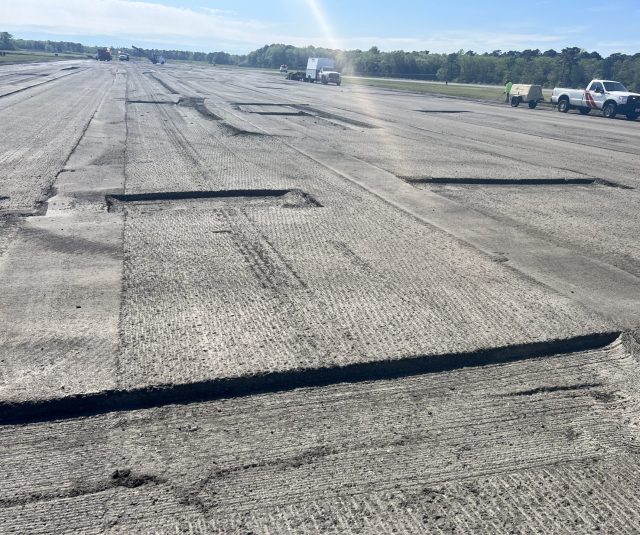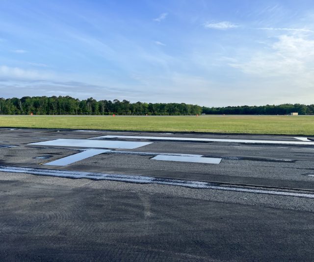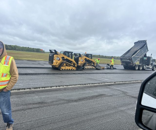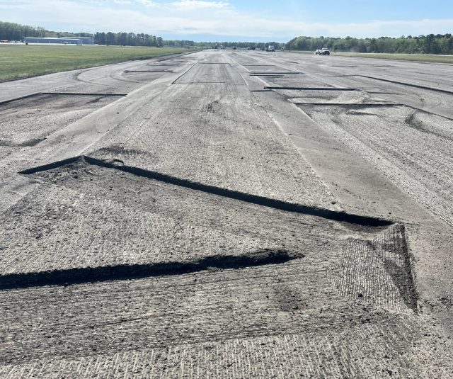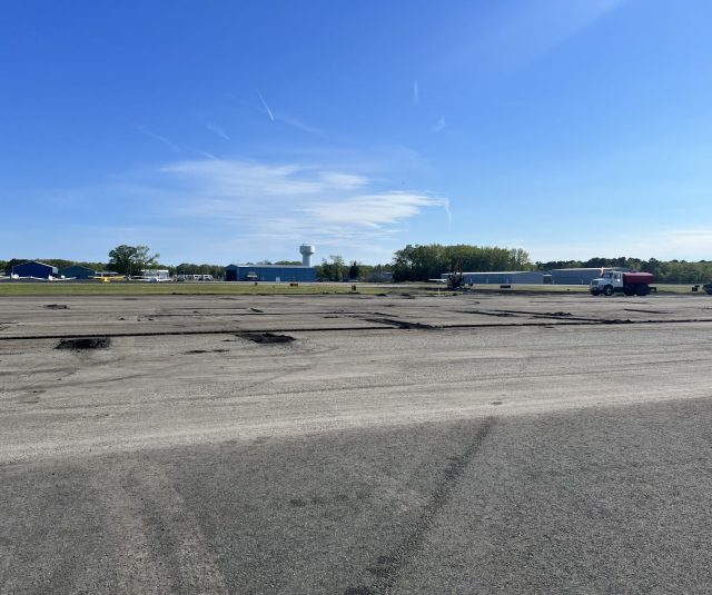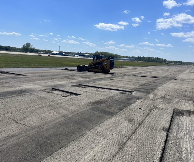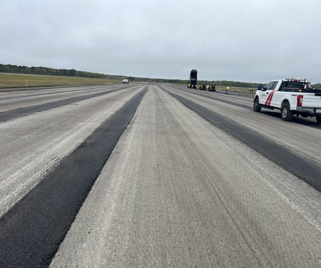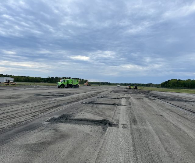 Road-Con was retained by the Delaware River and Bay Authority (DRBA) to rehabilitate one of two active runways at the Cape May Airport. The project was phased to allow for short runway usage while diverting most traffic to the other runway, which remained in service. Our scope of work included “profile” milling of the existing runway surface to remove existing undulations. While prior contractors performing this item of work utilized a vast series of grade marks and stringlines, our survey team recorded extensive surface elevations prior to the start of work, and using the design documents, developed an electronic 3D model of the surface. This data was uploaded into our milling machine’s 3D system control, which was provided by Topcon. With millimeter control instruments locked in on satellites placed adjacent to the runway, the mill provided the varying depth cut required for the surface. Next, existing joints and cracks were opened with a smaller mill and received sealant and patching. Finally, a 2-inch Superpave Wearing Course was installed following by transverse grooving and striping for aircraft safety.