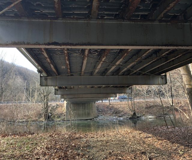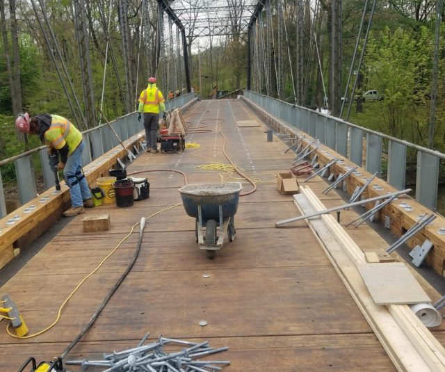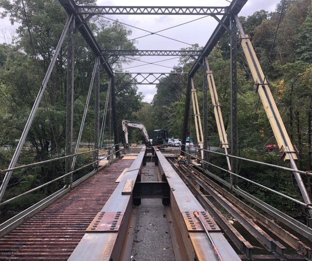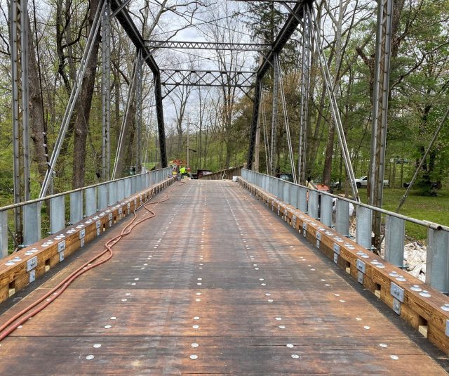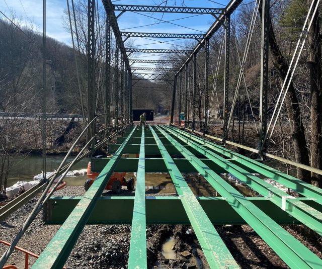 Built in 1904, Zettlemoyer’s Bridge is a historic Pratt truss bridge carrying Long Road over Maiden Creek in Berks County. Over the years, the bridge underwent two major rehabilitations: 1958 to replace the wooden plank deck, and 2020 to replace deteriorating steel members and failing bituminous deck. Prior to the 2020 rehabilitation, Zettlemoyer’s Bridge was closed to traffic in September 2012 due to its deteriorated condition. Road-Con contracted with the County of Berks to complete the rehabilitation of the structure in early 2019 to replace the existing steel floor beams, stringers, connecting pins, and install a new laminated timber deck with bituminous wearing surface. Truss bridges are difficult structures to rehab, in part because of the complex calculations, temporary supports required, and special construction sequences needed to replace every steel member. During the construction phase, the County of Berks authorized the cleaning and painting of the existing truss, which put the finishing touch on this beautiful bridge.
